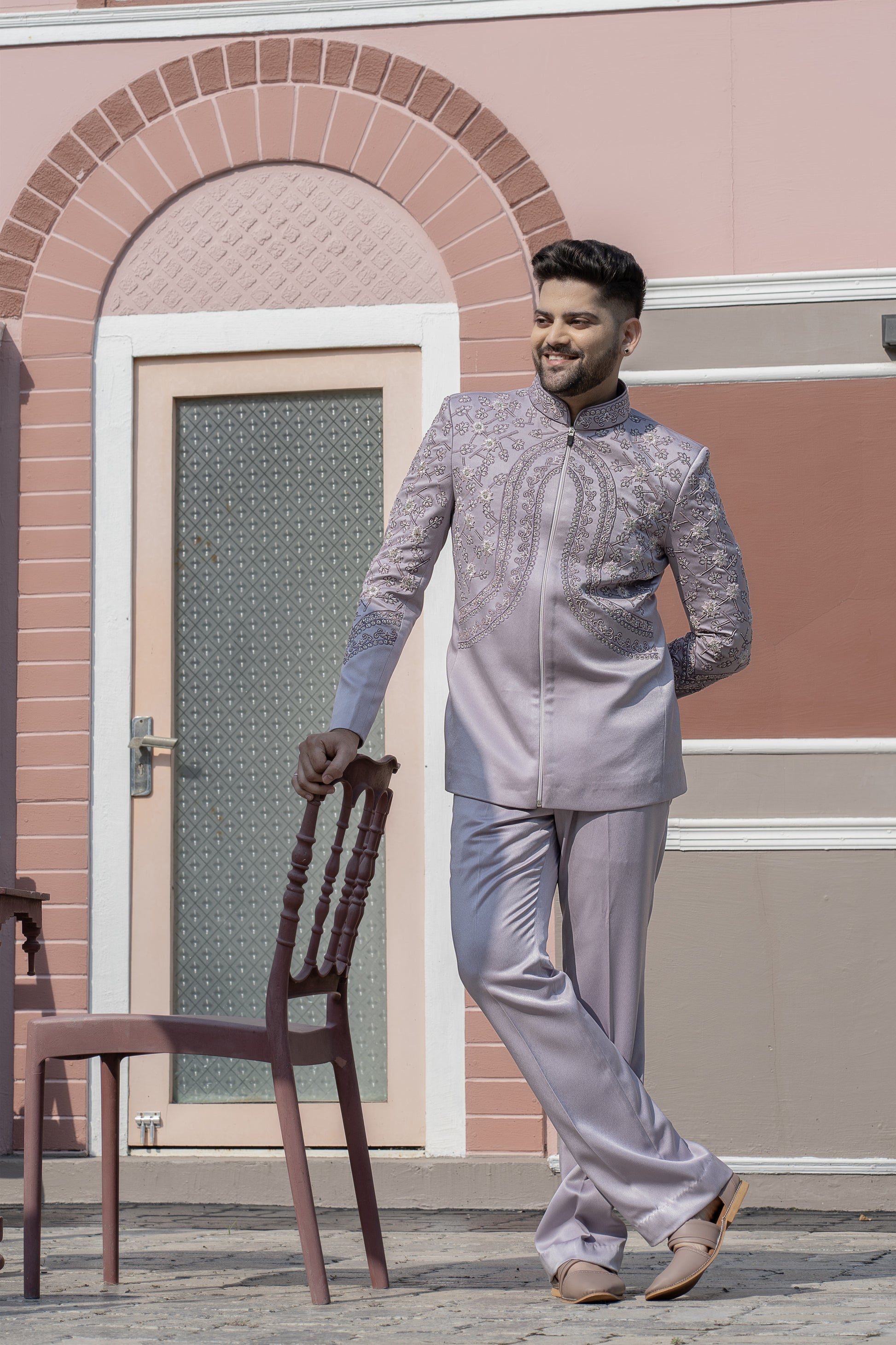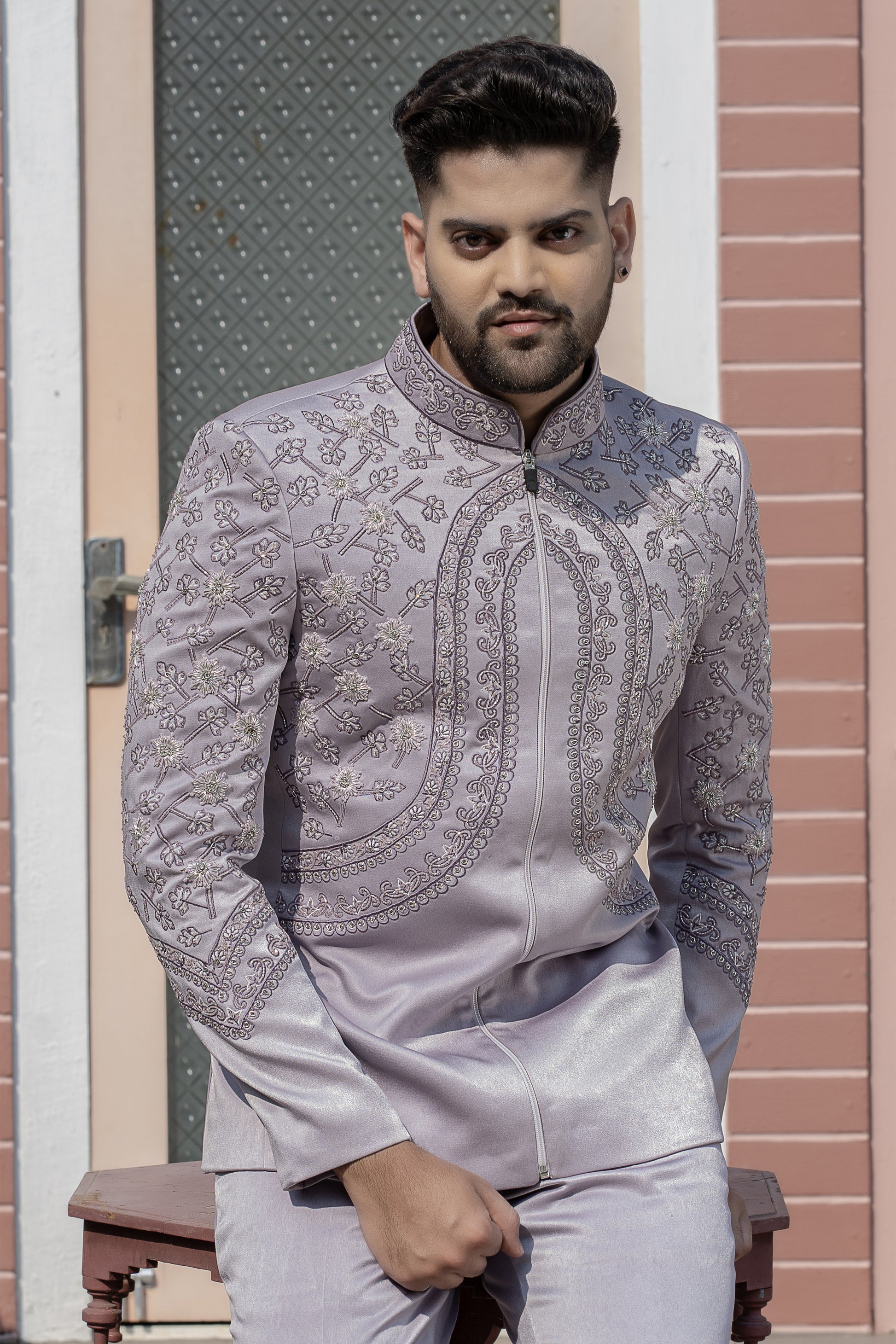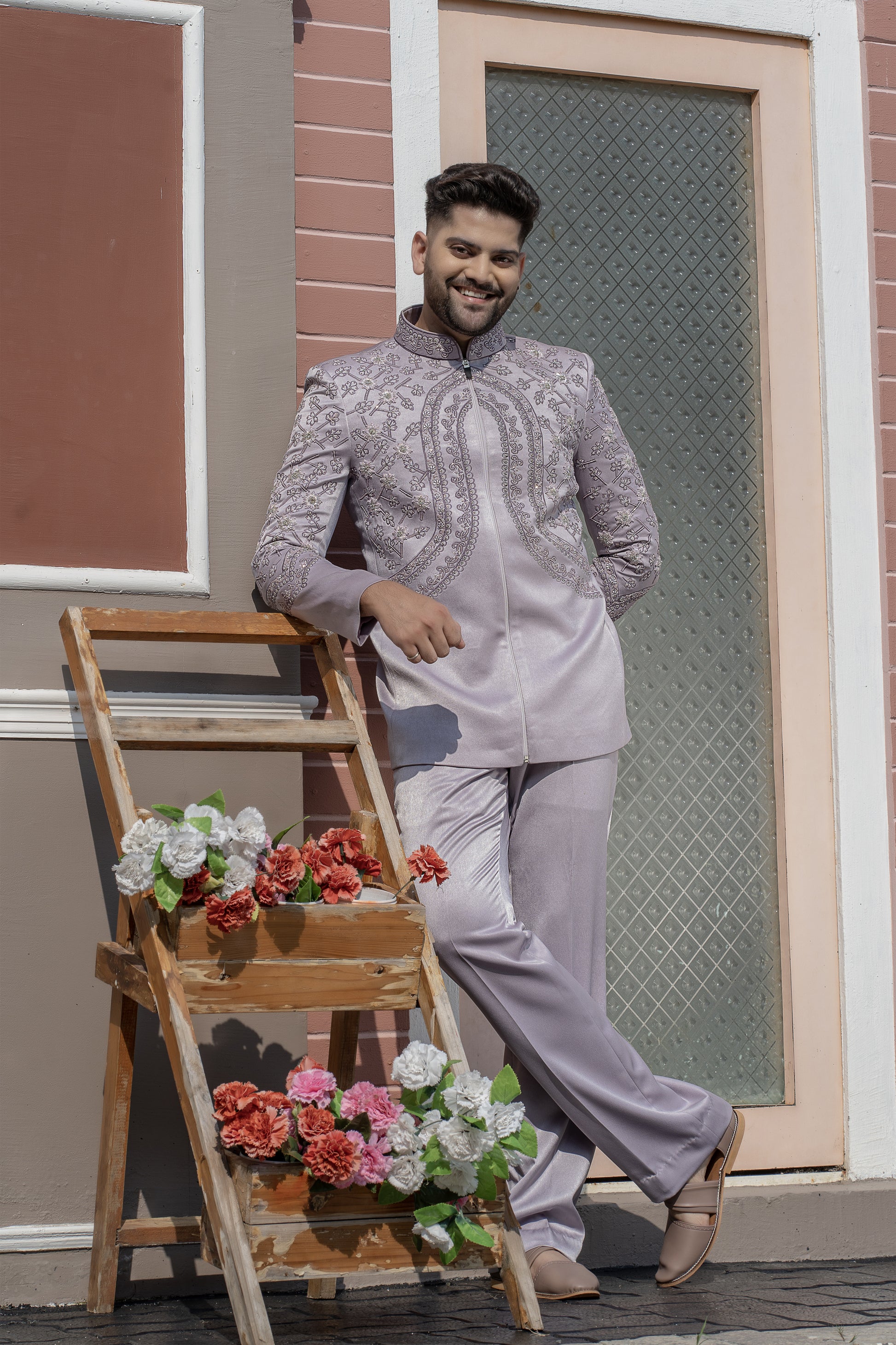 Row Silk Fabric Light Purple Color Jacket With Beautiful 3D Flower Hand Embroidery Work Color Combination Special For Carnival Function With Matching Bell Bottom Pant.