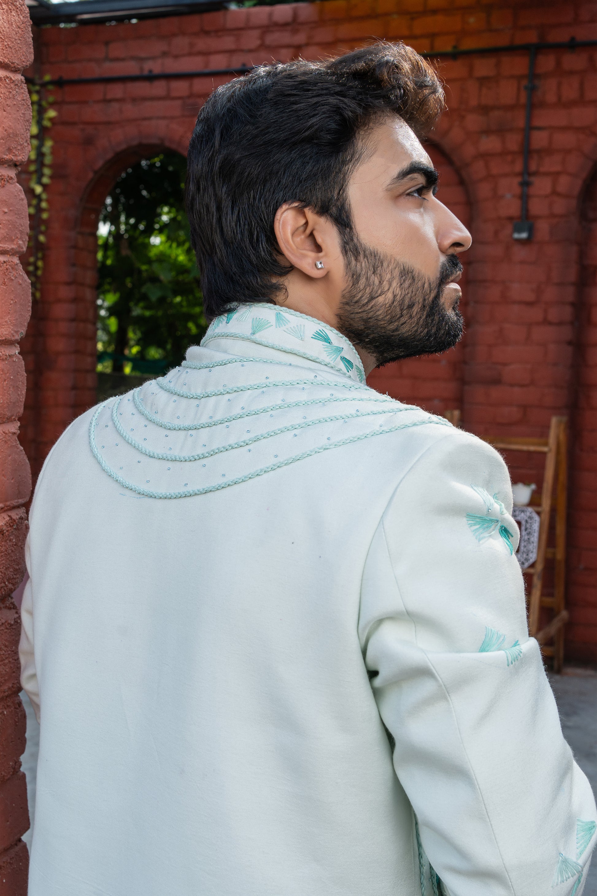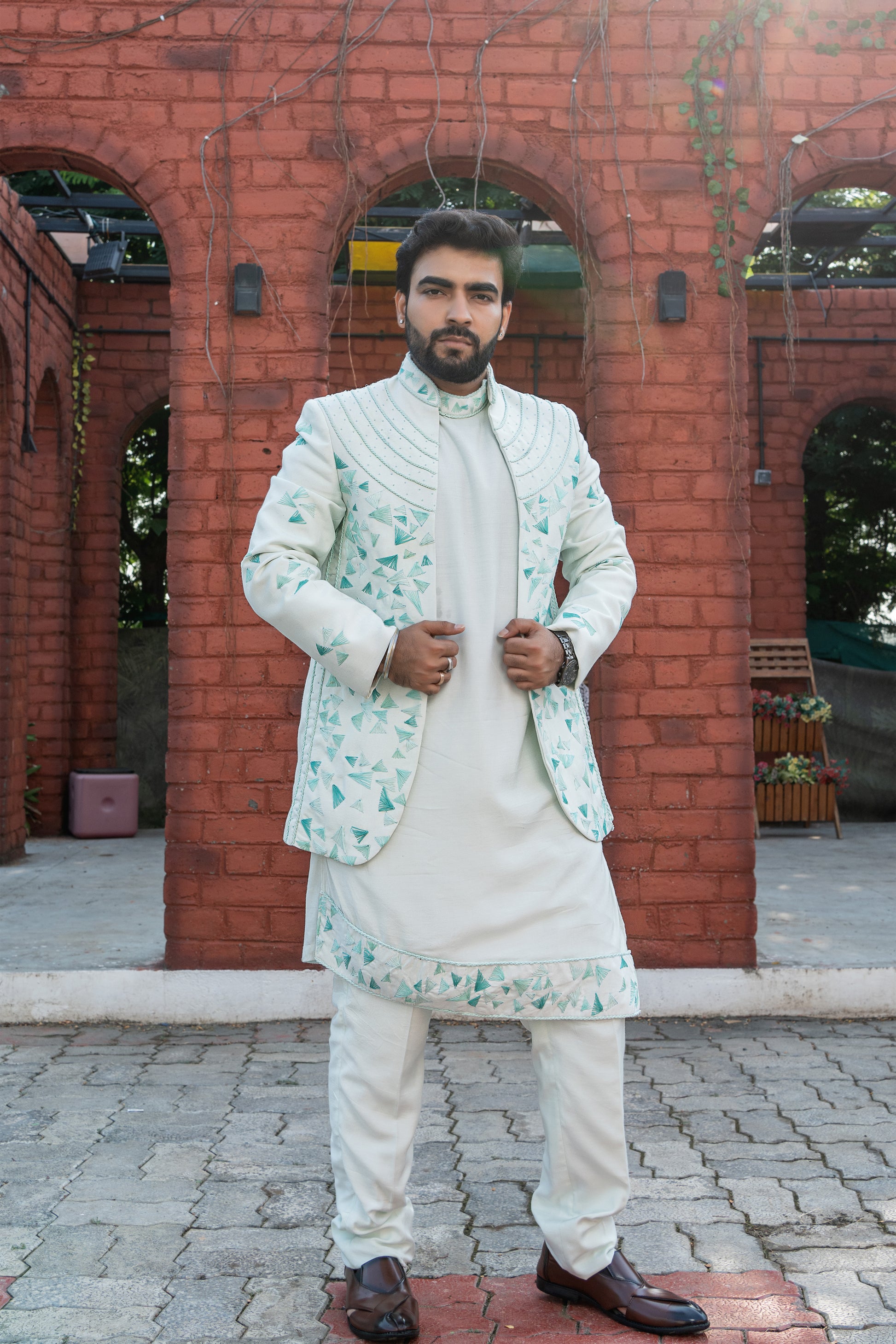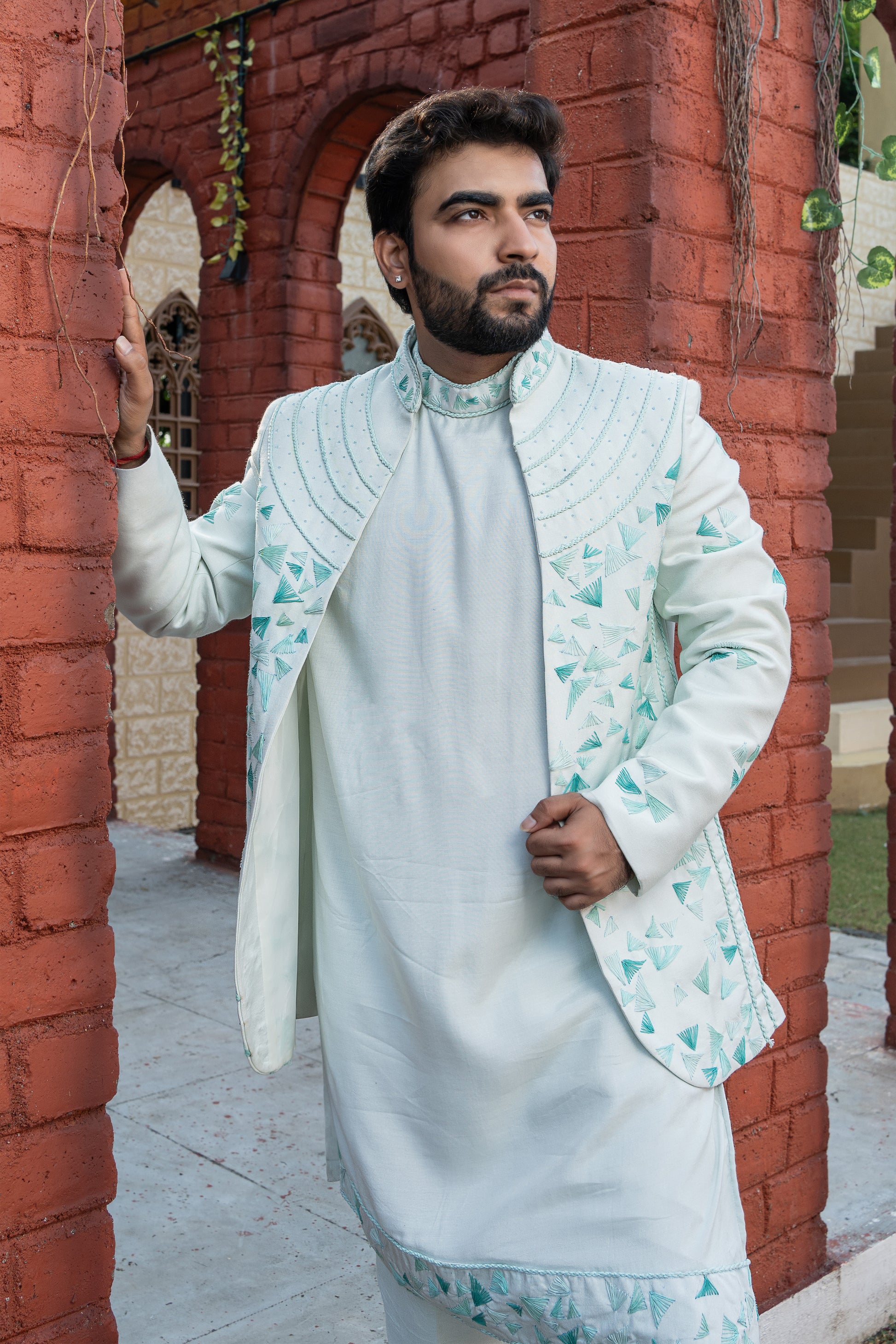 Sea Green Color Dola Silk fabrics Open Indo-Western With Advance Dori Khatli Work With Kurta And Pant.