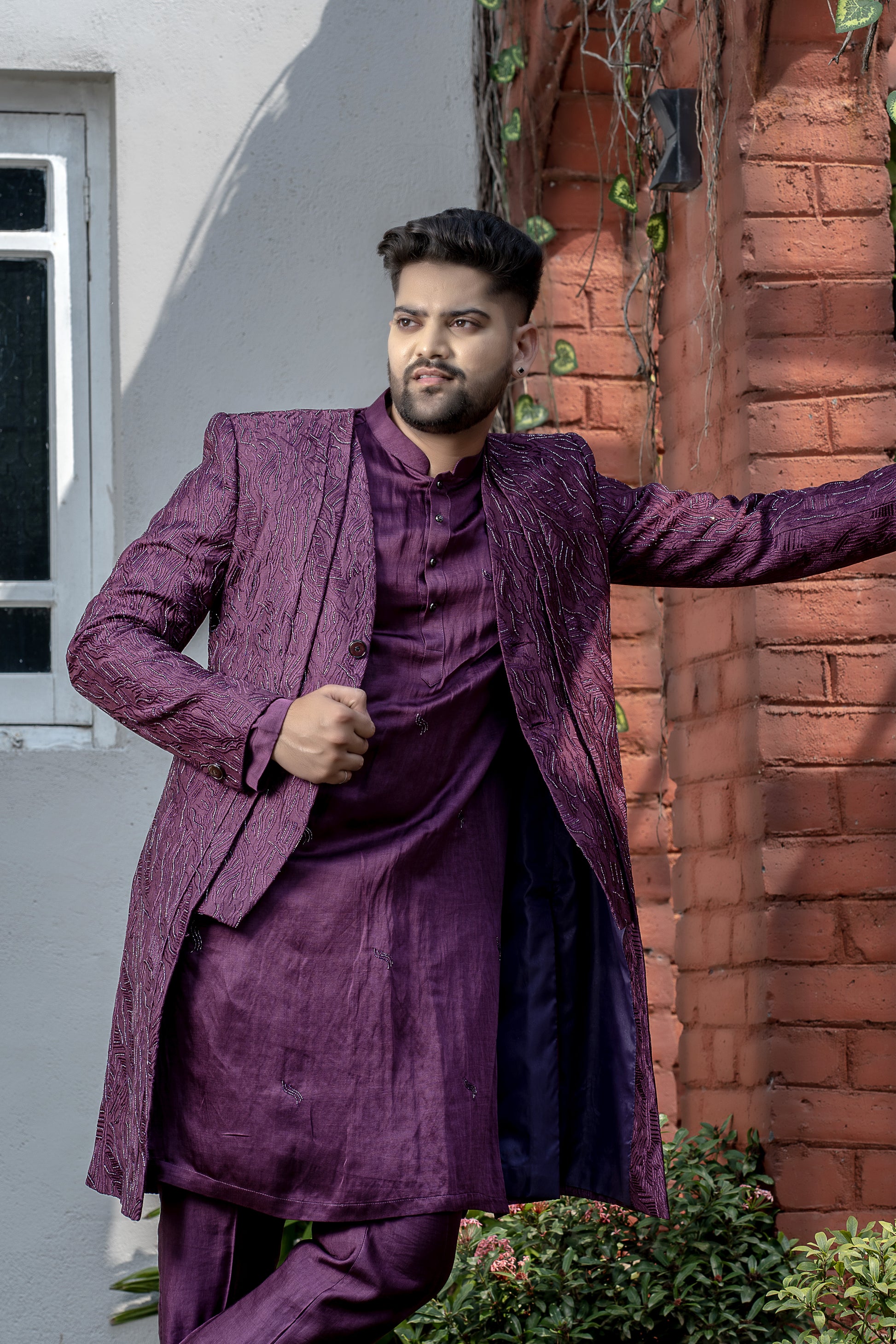 Purple Embroidery Fabric Designer Indo-Western With Matching Thread moti and katdana Khatli Work With Style Kurta And Pant.