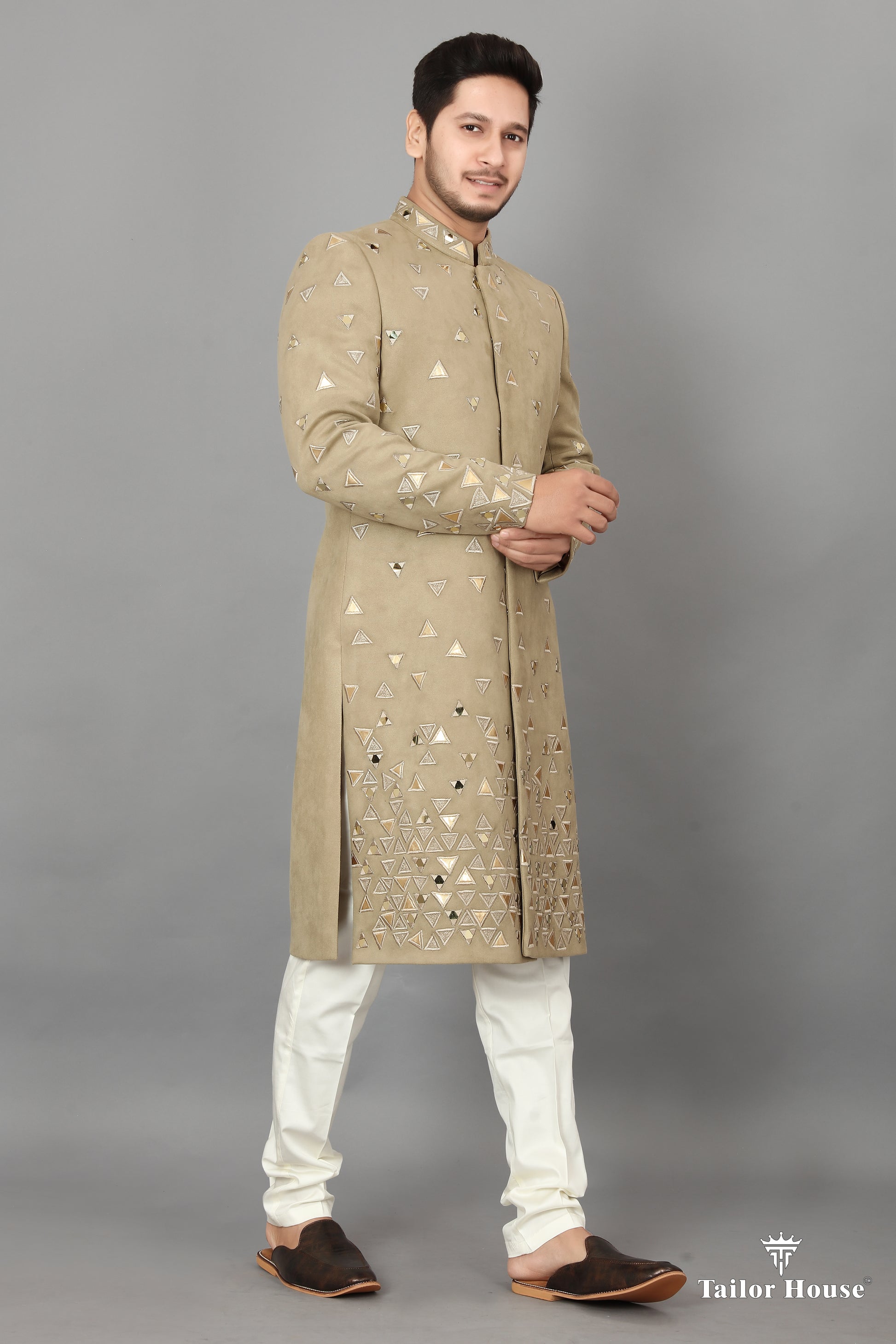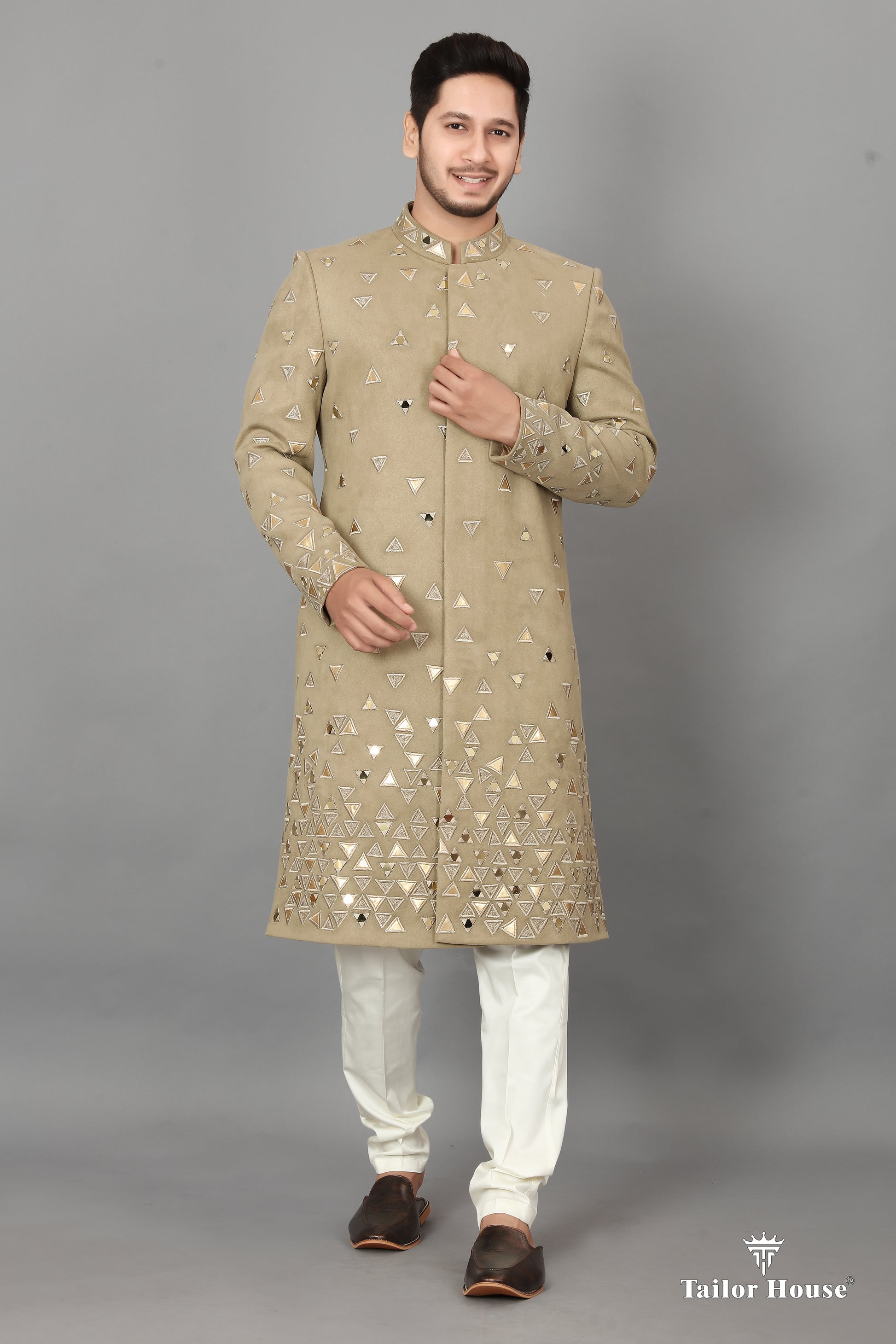 Khaki highlighted with striped glass beads hand embroidery and satin lapel paired with slim fit