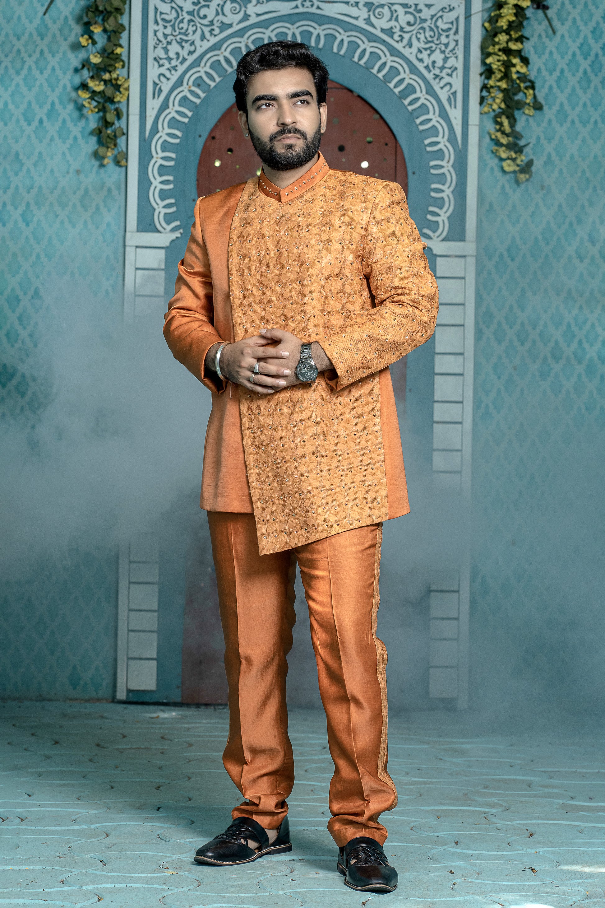 Orange Embroidery Designer Jodhpuri With Beautiful Katdana And Flower Sequence High Light Khatli Work With Matching Designer Pant.